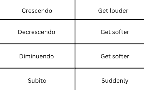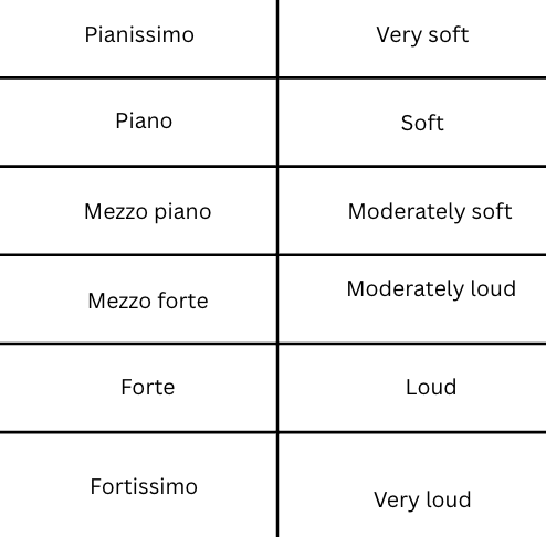 The following musical terms indicate the volume at which you should play. They are listed in order from soft to loud.