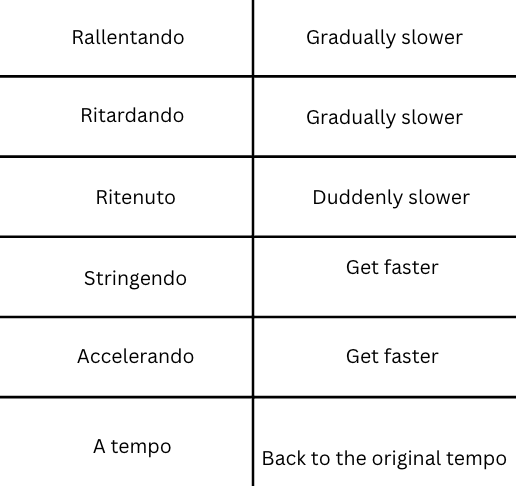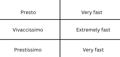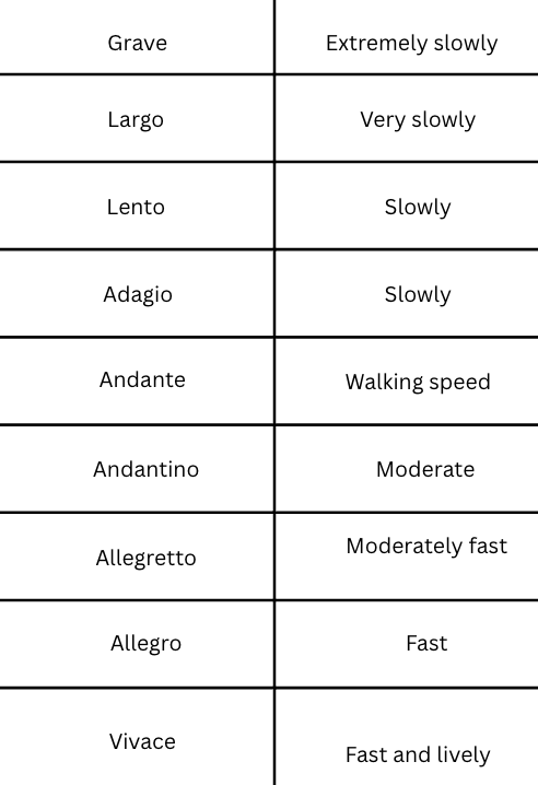 Tempo is the Italian word for speed. The following markings will be indicated at the beginning of the piece, and they are listed from slowest to fastest.