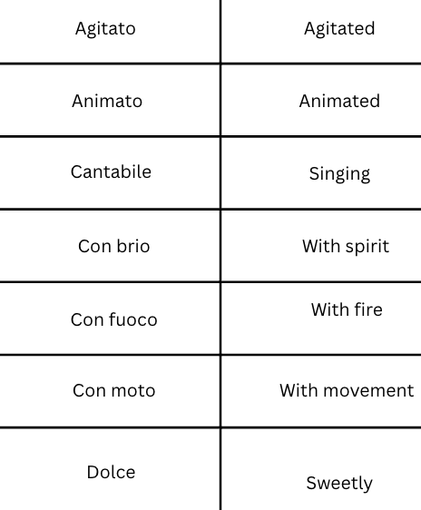 These terms indicate the character in which pieces or passages should be played.